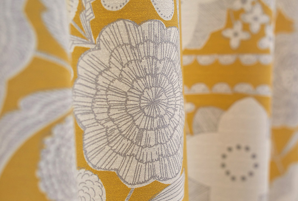 デザイナーこだわりの大きな花柄は、手描きの線で大胆かつ繊細に表現されています。