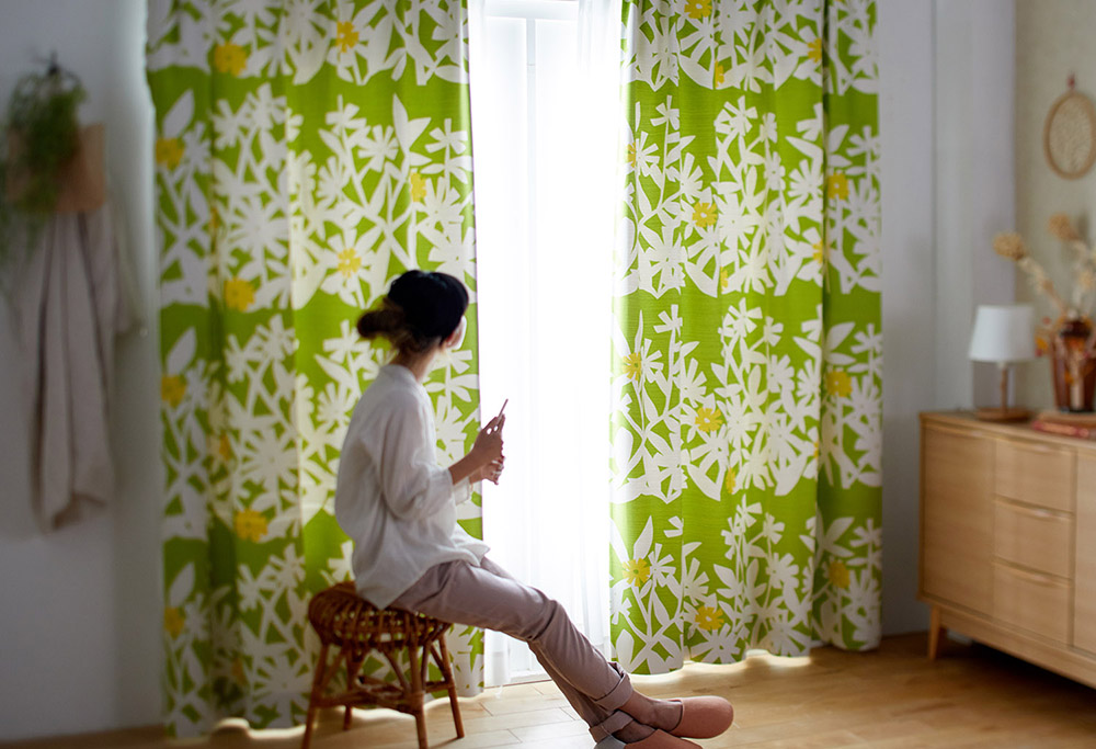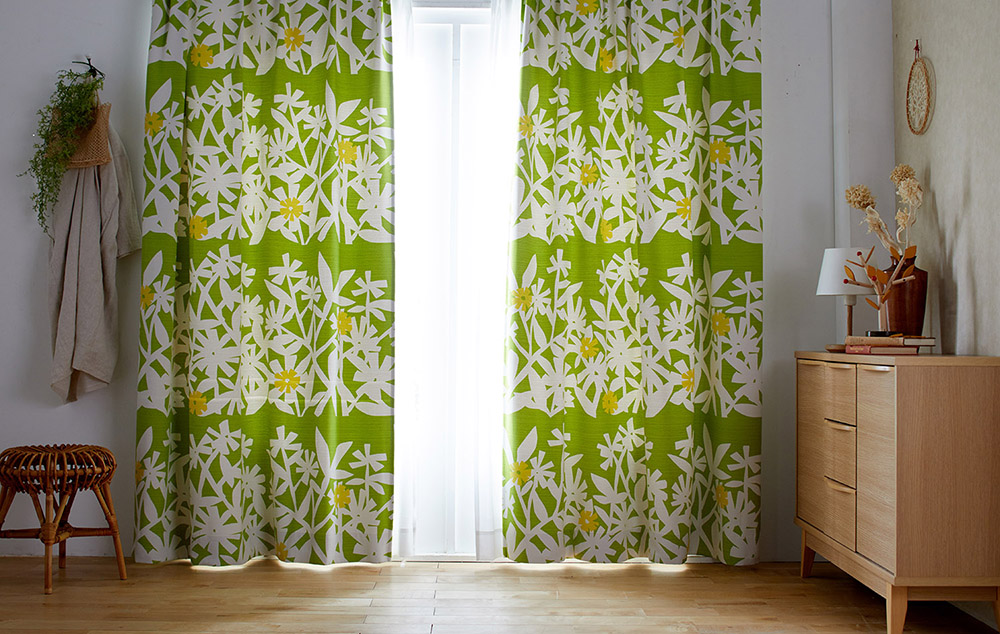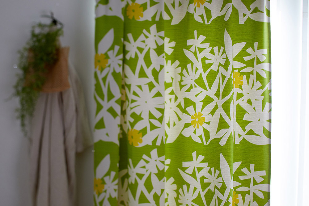 イエローグリーンのカーテンは、パッと部屋の雰囲気を明るくしてくれます。午後の柔らかな光がリラックスさせてくれそうです。