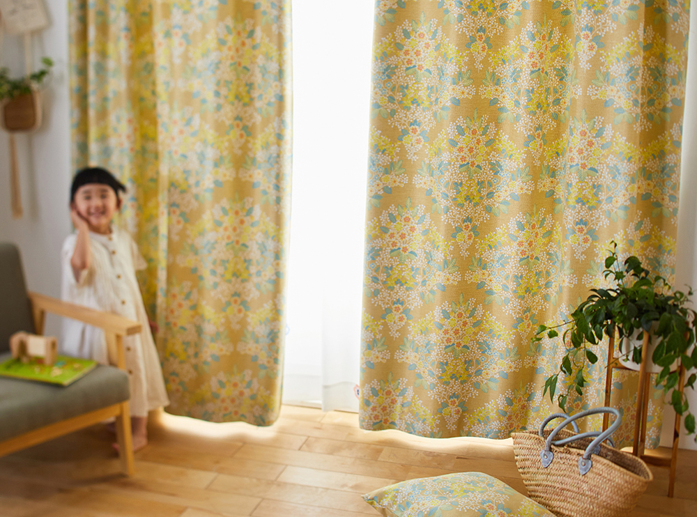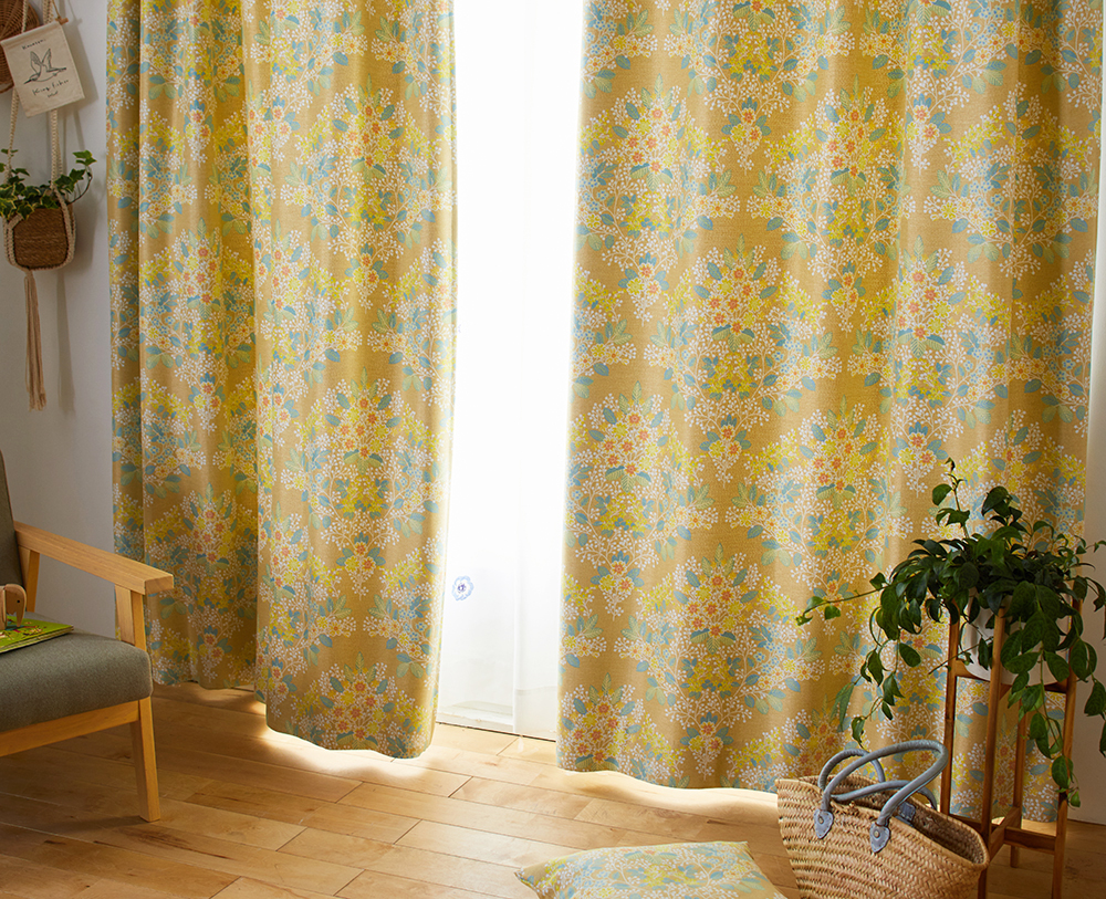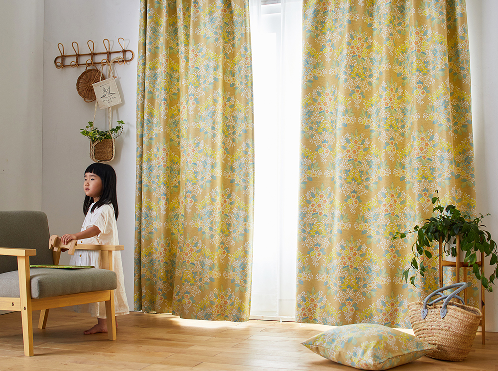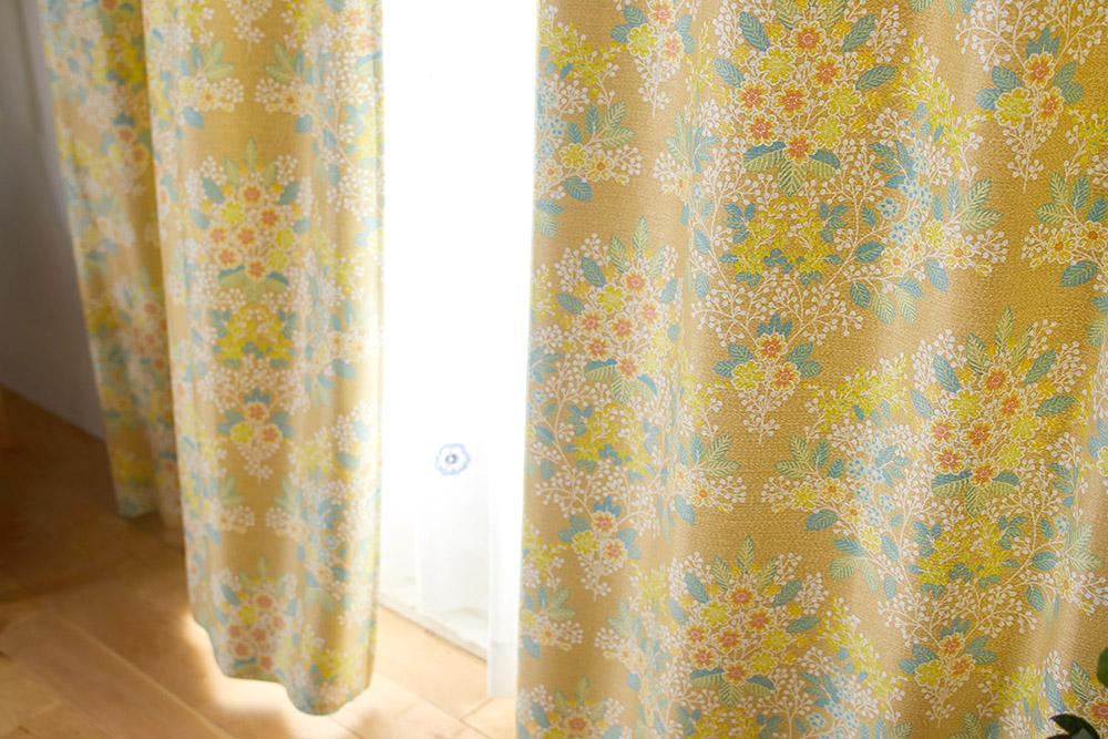 お部屋がパッと明るくなる綺麗なイエローのカーテン。小花のブーケ柄が可愛くなりすぎず大人エレガンスな仕上がりに。