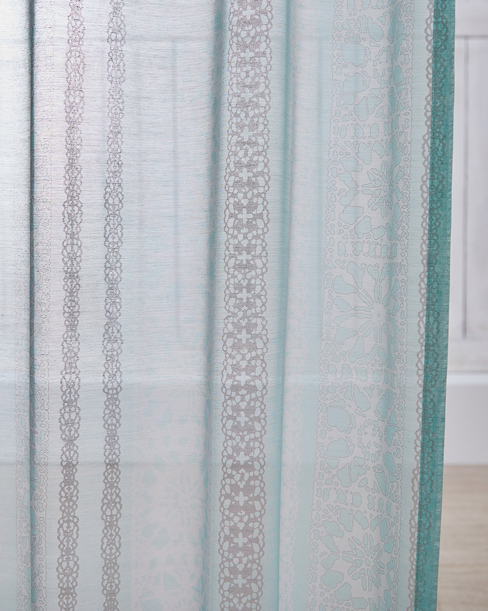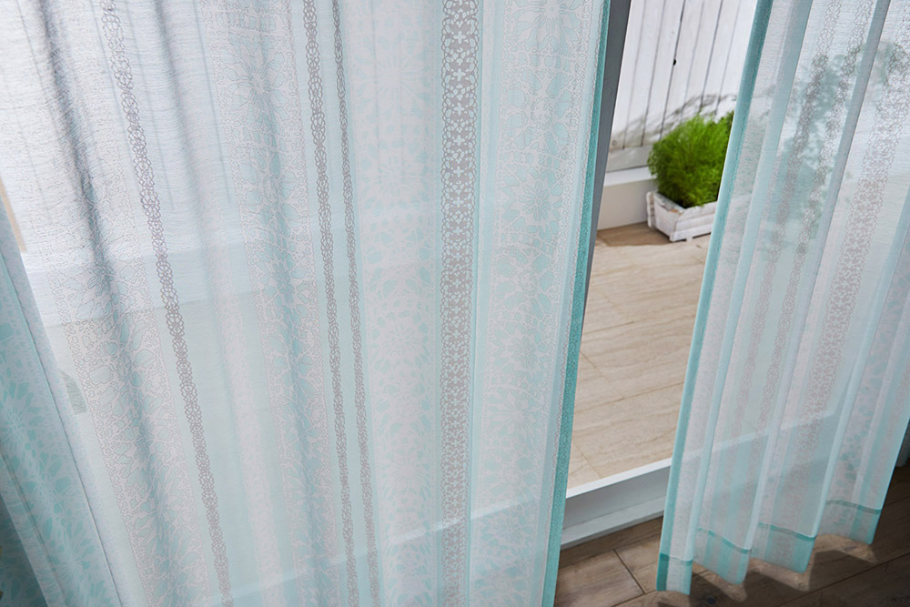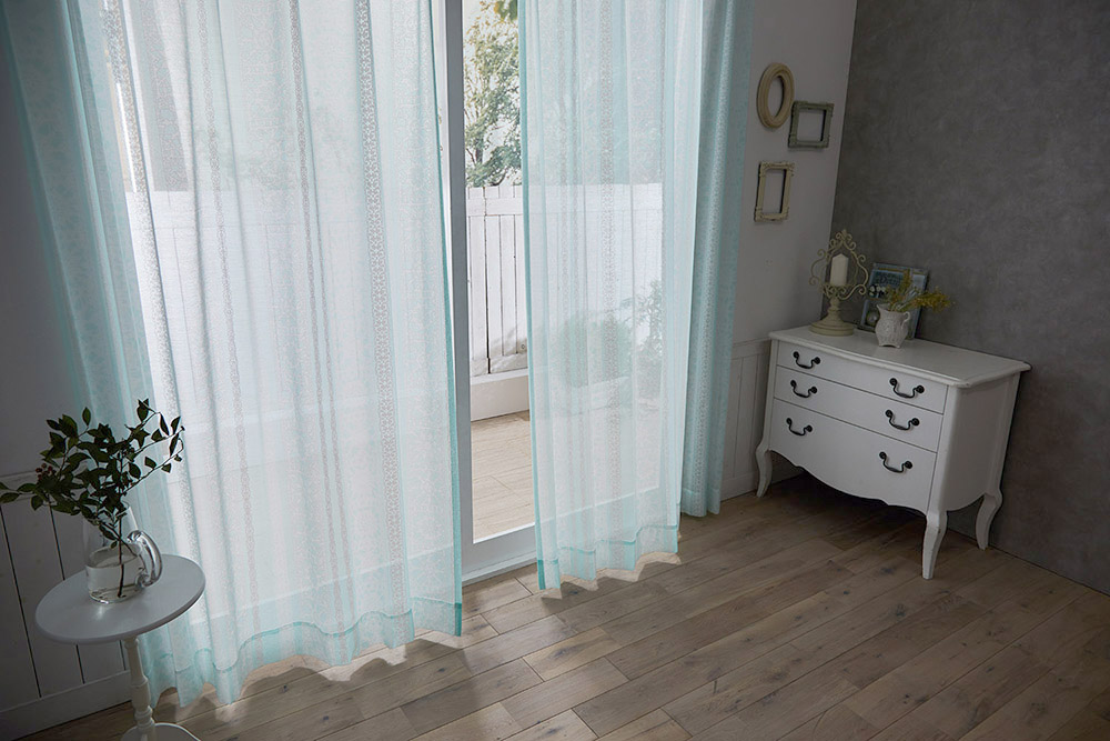 色鮮やかなミントブルーのシアーですが、窓辺に吊るすといい感じに透けて爽やかです。