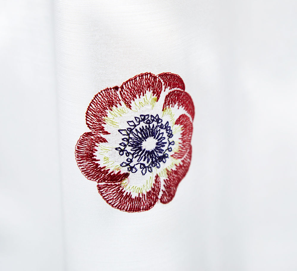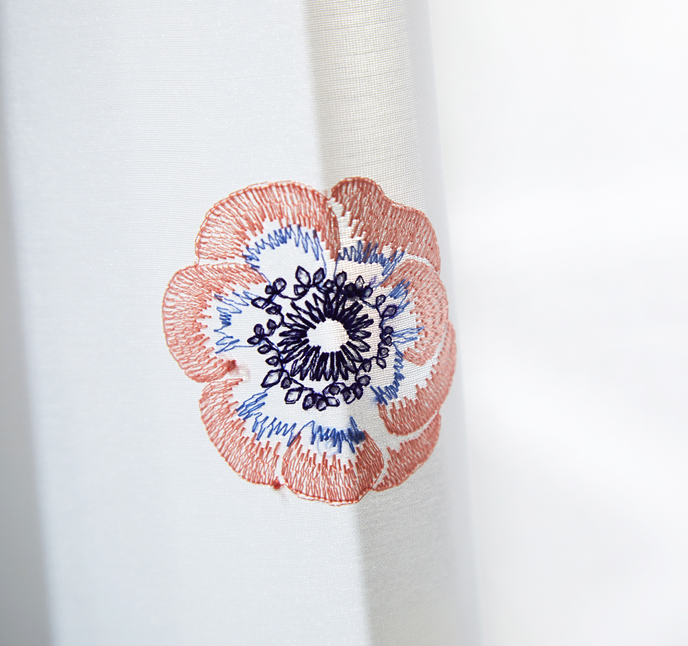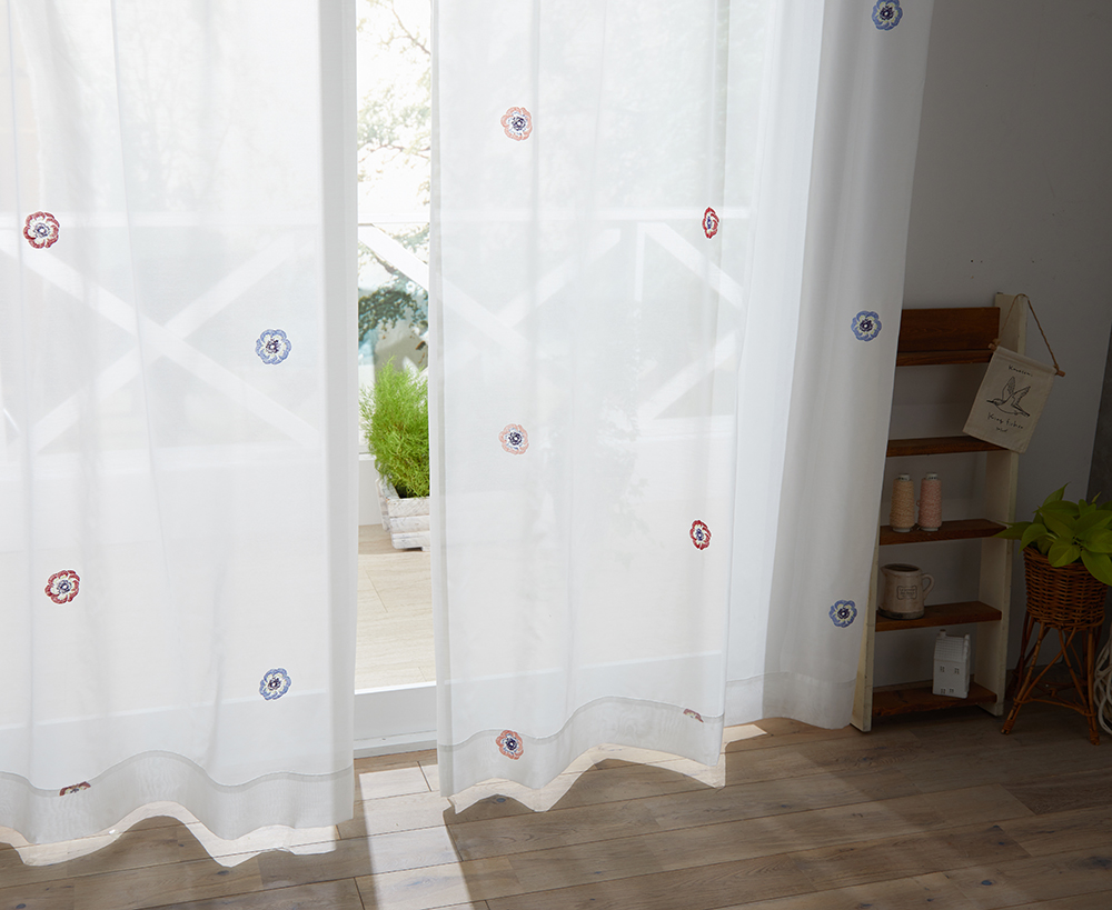 コクリコの花を立体感ある刺繍を施したシアーカーテンです。