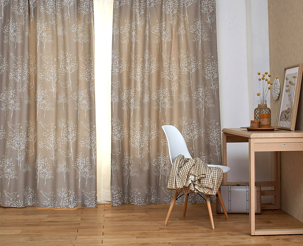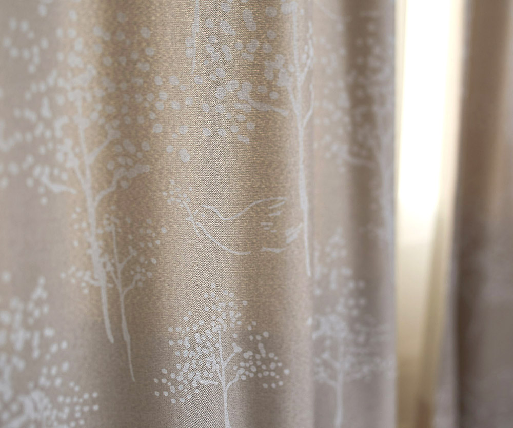 手持ち感のあるカーテンに、白色インクで表現された小鳥モチーフはイラストのようなタッチで表現されています。